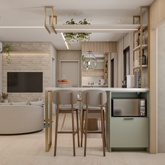 O piso em tom claro, traz amplitude , calma e leveza para o ambiente. Ele não possui muitos veios marcados. A textura de cimento queimado clarinha traz movimento e leveza e nos lembra a textura da areia do mar, o que nos remete a tranquilidade. Para a primeira opção de cores, trouxe a cozinha em verde com amadeirado e serralheria dourada. O verde nos instiga a alimentação saudável e o dourado remete a sofisticação.